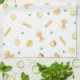 Pasta & Polka Dots design features watercolor illustration of delicious pasta varieties, including Farfalle, Fusilli, Orecchiette, Conchiglie and Penne with cute green polka dots.