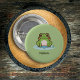 A green button with an illustration of a cute frog on its pond and customisable text below! Just add to your clothes or accessories for a funny touch!