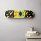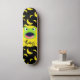 Modern, cute, cool and fun skateboard design. This design features a surprised green frog face with a yellow banana pattern of moon sun and stars with calligraphy font custom name. Perfect for kids on holiday season, special occasions like birthdays, family reunions or as a "everyday gift"