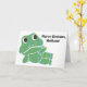 This greeting card features a cute retro style frog illustration. The green cartoon frog has blue and yellow speckles. Both the message on the front and the fun message on the inside can be customised with your own message.