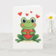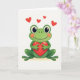 This greeting card features a cute, human-like frog centered on a plain white background. The frog is bright green with smooth shading, big shiny eyes, and a wide smile, with soft pink blush on its cheeks. It holds a large red heart close to its body, like it’s offering it with care. Above the frog’s head, several smaller red hearts float upward, suggesting love that keeps growing. There’s no text on the card, so the sweet image does all the talking. The simple setting and strong green-and-red color contrast keep the focus on romance and warm friendship ❤️💌. It feels like a small, sincere way to say “I care,” especially with a little chocolate-and-flowers energy 🍫. Hope it helps you share kind Valentine’s Day sentiments with someone special.