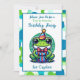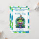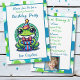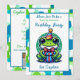 Cute birthday party invitations for a little boy's birthday. An adorable frog in a birthday hat holding a gift with a cute polka dot background in blue and green. Add your birthday party's info in the personalise area.