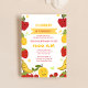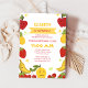 the design shows a birthday invitation for kid's in yellow and red surrounded by lots of fruits. the design is extremely cute and unique and will be ideal for any kids.