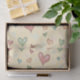 Cute, fun, hearts with curly swirls for newborn gifts or baby showers. Neutral colour hearts are orange, red, blue, and green on a pale yellow background.