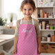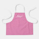 Cute kids' apron featuring a two-tone pattern of light pink polka dots on a darker pink background. Personalise it with your child's name in a fun white curlicue font.