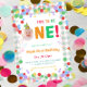 Fun to Be One Birthday Invitation Template, Digital Fun to Be One First Birthday colorful balloons, Green Gingham and confetti with one photo of your choice. Personalize the birthday party invites by adding your child's name, age, and party details.