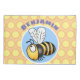 This cute bumble bee is drawn in happy cartoon style with a yellow, blue and orange patterned background. Add some buzz to a child's room!
