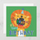 Cute and funny jungle lion with wide open mouth. With partyhat, dotted background and handlettered text. Bright colours. Perfect for your kids' birthday!