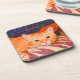 Enjoy these funny, adorable, cute orange tabby cat, digitally painted photograph on this square plastic custom name set of 6 coaster set for cat lovers. Blue and green background. Mischievous looking cat laying down. Copper, ginger colours. Image copyright Marg Seregelyi Photography.