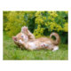 A funny and frisky kitten, a red tabby and white baby cat with wonderful blue eyes, at play and showing its claws outside in green grass, it makes you smile. A cute baby cat photo taken by Katho Menden. This poster is a gift idea for cat lovers.