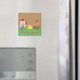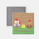 Colourful fridge magnet comes with cute cartoon of yellow chicken, brown hen and white rooster and a wood grain background and customisable message. Current message reads "Chicken Anyone?