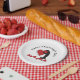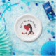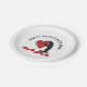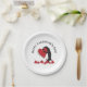The product design features a penguin holding a big red heart. This charming animal illustration makes cute modern and unique paper plates with personalised text - Party supply ideas for Valentine’s Day - Happy Valentine's Day!