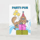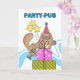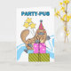 Partypus! Cute and funny birthday greeting card with an illustration of a platypus wrapping birthday presents and holding star balloons. Cute platypus pun message written inside. Art, image, and verse copyright © Shoaff Ballanger Studios, 2025.