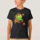 Cute, colourful frog leaping amongst the flowers with a happy and friendly smile on his face .