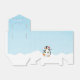 A cute winter illustration featuring a clumsy penguin in a good mood wearing gloves and earmuffs walking in the snow.