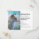 Birthday party invitation postcard with a photo of a cute fox standing alone. Set on a blue grunge background.