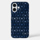 A cute and geeky iPhone 16 case with a light blue hipster eye glasses pattern on a navy blue background. Perfect for nerds, book lovers, optometrists, and more!