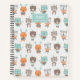 Cute gender neutral animals: cat, bear, rabbit, panda in soft colours: beige, brown, grey, mint, orange. Geo pattern at the back