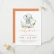 A modern baby shower theme featuring a hand drawn elephant sat in a beautiful arrangement of tropical flowers and leaves. "Baby shower" appears below in a stylish script, just above your custom baby shower details. These cards reverse to an orange colour.