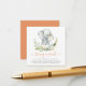 A cute baby shower theme featuring an elephant sat in a beautiful wreath of tropical flowers and leaves. "bring a book" appears below in a stylish script. These cards reverse to an orange colour.