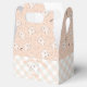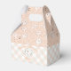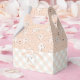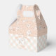 This is an adorable, gender neutral pastel orange Halloween 1st Birthday Favour Box. The background features a cute hand-drawn pattern of ghosts, bats, stars and moons on a pastel orange background. The front and back feature a cute ghost on a orange & green gingham pattern personalised with name and date.