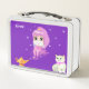 Cute genie, magic lamp, cat & stars on violet metal lunch box