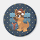A round magnet with illustration of cute German Shepherd with a present on a starry night dark blue background, illustrated by Radka2D