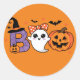 Playful ghost, pumpkin, and witch hat sticker for Halloween decoration.