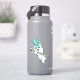 This vinyl sticker is a cute white ghost with big blue eyes wearing a blueish green top hat with a gold ribbon holding an ornate black cane topped with a gold skull.