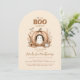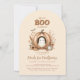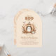 A cute baby shower invitation featuring "Our little BOO is almost due!" in soft brown modern typography and stylish script on cream background plus a sweet drawing from a ghost in a pumpkin.