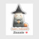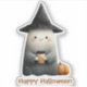 A sweet and friendly ghost in a starry wizard hat holding a cup of coffee (or hot cocoa) brings a playful twist to Halloween style. With the phrase “Happy Halloween,” this design is perfect for children’s products like hoodies, T-shirts, blankets, mugs, or greeting cards. Its soft, cute aesthetic makes it ideal for kids who love the fun side of spooky season, while still keeping the festive Halloween spirit alive.