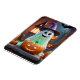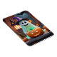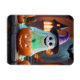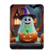 A 3D rendered image of a ghost wearing a purple witch hat. The ghost has a big smile and is holding a pumpkin. There are other pumpkins around the ghost, some with faces carved into them. The background is a spooky house with bats flying around. The colour scheme is predominantly orange.