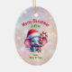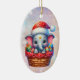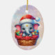 Here's an adorable Christmas ornament for a special grandson, granddaughter, son or daughter. On one side is the image of a cute elephant wearing a red and white Santa Claus hat. The little elephant pops out of a wicker gift basket among brightly wrapped presents. The image is placed on a pink and lavender bokeh background. The back of the ornament has the same bokeh background with a second image of the elephant with a candy cane, and your custom text. Easy to customise for your own child. AI generative content.