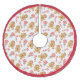 This fun Christmas tree skirt has a pattern of gingerbread man cookie images, red and white candy canes, and stick candies. The images are placed on a white background, with a matching red border. Appealing to kids of all ages for the Holiday season!