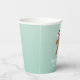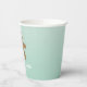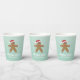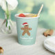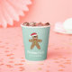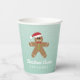 This Christmas cookie exchange paper cup features a cute gingerbread man wearing a Santa hat. The background is a soft teal with white confetti dots to look like snow falling.