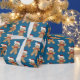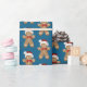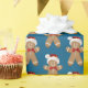 Cute gingerbread man cookie with Santa Claus cap on blue background.