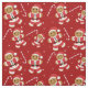 Christmas fabric featuring gingerbread man cookies in Santa outfits. Th smiling Xmas cookie illustrations are in a pattern with candy canes and snow. The fabric has an overall red and white colour scheme and is ready for your holiday project.