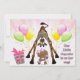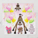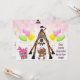 Cute African American girl baby shower invites. Fun, happy, whimsical cartoon giraffe with his head down looking between his legs at a pretty ethnic baby girl holding pink cupcakes. Next to them is a colourful gift box with ribbon. The background is a beautiful bright and cheerful pink burst with colourful balloons and streamers. These stylish, fashionable invitations are decorated both sides. Trendy, girly, modern invitations for ethnic girls. PLEASE NOTE: All invitations on Zazzle have flat printed images. Text, font and colour of font are personalizable / customisable on the back of the invitations, text on the front is fixed. If you need assistance customising your product please contact me through my store and I will be happy to help. Some elements purchased from resaleclipart.com.