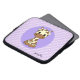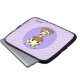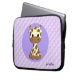 This laptop sleeve shows a baby giraffe cartoon with big black eyes on a geometric purple background. The giraffe is so cute it will please children, but certainly also their moms or dads.