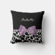 A cute black and white giraffe print throw pillow with a girly lavender purple ribbon tied into a feminine bow. Personalise this pretty animal print design by adding your name. Reverse side has a black and white giraffe pattern. Flat printed image, not actual bow.