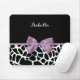 A cute black and white giraffe print mousepad with a girly lavender purple ribbon tied into a feminine bow. Personalise this pretty animal print design by adding your name. Flat printed image, not actual bow.