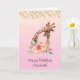 Happy birthday greeting card with a cute drawing in watercolors of a mom and baby giraffe. The mother giraffe is resting her head on top of the baby giraffe, loving and adorable. Pretty pink, yellow, green watercolor flower bouquet placed underneath this darling pair. Decorative leaves hang down from the top.