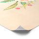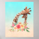 A poster with a cute drawing in watercolors of a mom and baby giraffe. The mother giraffe is resting her head on top of the baby giraffe, loving and adorable. Pretty pink, yellow, green watercolor flower bouquet placed underneath this darling pair. A gradient background created with a delicate turquoise blue color blending into a sandy brown color.