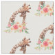 Fabric with a cute drawing in watercolors of a mum and baby giraffe. The mother giraffe is resting her head on top of the baby giraffe, loving and adorable. Pretty pink, yellow, green watercolor flower bouquet placed underneath this darling pair.