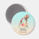 A baby shower magnet with a cute drawing in watercolors of a mum and baby giraffe. The mother giraffe is resting her head on top of the baby giraffe, loving and adorable. Pretty pink, yellow, green watercolor flower bouquet placed underneath this darling pair. A gradient background created with a delicate turquoise blue colour blending into a sandy brown colour.
