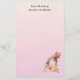 Stationery paper with a cute drawing in watercolors of a mum and baby giraffe. The mother giraffe is resting her head on top of the baby giraffe, loving and adorable. Pretty pink, yellow, green watercolor flower bouquet placed underneath this darling pair. A gradient background created using a soft pink colour blending into light peachy orange colour.