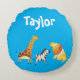 A lovely African safari scene, this round pillow features a blue background with wildlife such as a zebra, giraffe, and lion. Customise a name in white font. Order your pillow today!