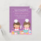 Plan a baking birthday party and get your children guests involved in the fun baking process and make cupcakes and cookies which they can enjoy at the party or take home! This invitation features two cute little girl chefs. The girl with the red hair clip is holding to a pipping bag and decorating the cupcakes with pink frosting. The girl with pink hair band is holding a whisk and preparing the baking mixture. Plenty of baking ingredients are on the table which includes the sugar container, cup, bowl, tray of cupcakes, carton of eggs, mixing bowl, butter and milk. What is cooking at the party? Colour palette of pink and purple is girly and sweet for a birthday girl! Reverse page of purple polka dots pattern. Personalise easily with your party details!