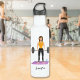 This water bottle features Destei's illustration of a cute girl who is deadlifting a barbell up the ground. The girl has brown long hair and she is wearing an orange colour shirt. The girl is standing on a purple mat that has a blue water bottle on it. There is also a personalizable text area for a name.