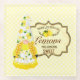 Sweet design features girl gnome with lemon patterned costume, bordered sign "When life gives you lemons, make something sweet" on pastel yellow buffalo plaid background